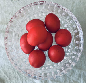 At some point around the meal, we all grab a hard-boiled red-dyed egg and tap them together one at a time. Whomever ends with an uncracked egg, receives good fortune for the following year.