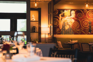The finer dining area, more formal with white tablecloths and beautiful views faces the north and west for sunset viewing. In this situation, ‘on the water’ means that exactly, actually on the water. The lighting in the finer dining area is dramatic while the Tavern side boasted dark wood flooring and tables surrounded with woven back chairs, reminiscent of a casual European Bistro. The Scandinavian ceramic wood burning fireplace was a standout feature that invited guests to sit at the cozy tables near it and warm up with an inviting cocktail.