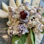 - Chicken Salad. Chop some of the remaining white chicken meat into small, bitesize pieces. Place in a bowl. Add diced white onion and celery, sliced red grapes, tarragon, salt, pepper, dijon mustard and mayonnaise (or a mixture of mayonnaise and yogurt).