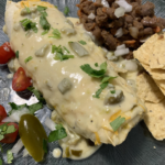 - Chicken Burritos. Mix together 2 oz. cream cheese, 1 1/2 C of remaining chicken cut to small pieces, 1/2 C Mexican cheese, 2 oz. canned green chiles, 1/2 t. cumin, 1/4 t. chili powder, 2 t. lime juice, salt and pepper. You want a thick mixture. If there is not quite enough chicken, add pinto beans. Place stuffing in 3 or 4 tortillas, roll and place in a greased baking dish. Make a sauce by cooking 1 1/2T flour into 1 1/2 T butter, whisk in 1 C chicken stock, salt and pepper, and 2 oz. canned chiles. Add 2 oz. cream cheese and stir until thickened, about 5+ minutes. Pour over burritos. Top with Mexican cheese and bake in a 350 degree oven until bubbly (approximately 20 minutes).
