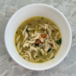 - Chicken Noodle Soup. Remove the meat from the bones and simmer bones in 16 C. water. Add roughly chopped onions, carrots and celery as well as a bouquet garni of bay leaf, fresh thyme, celery leaves, and parsley. Simmer for hours. Strain. Saute fresh chopped onions, diced carrots and sliced celery in butter. Add stock to aromatics, along with the small pieces of the chicken meat. Add thyme, salt and pepper. Bring to a simmer and then add about 8 oz. noodles. Cook according to the package. Taste for salt. Add chopped parsley.