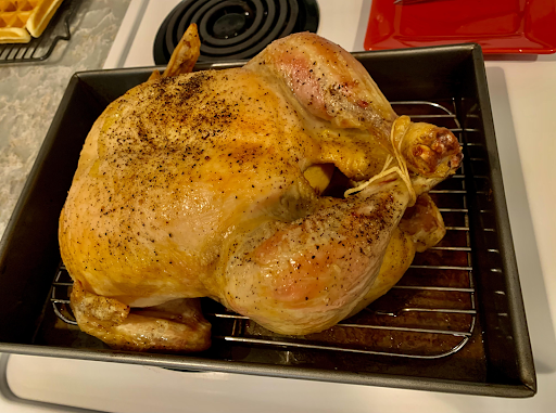 - Start with BIG roasted chicken. Wash, dry, salt the cavity, throw in an onion, ½ lemon and thyme. Rub skin with canola oil, sprinkle salt and pepper over the top and bake, uncovered, in a 350 degree oven until the thickest part of the thigh registers 165 degrees (About one hour). Rest and then slice a few pieces to serve as part of a roasted chicken dinner. (Consider adding a starch and green vegetable for side dishes.)