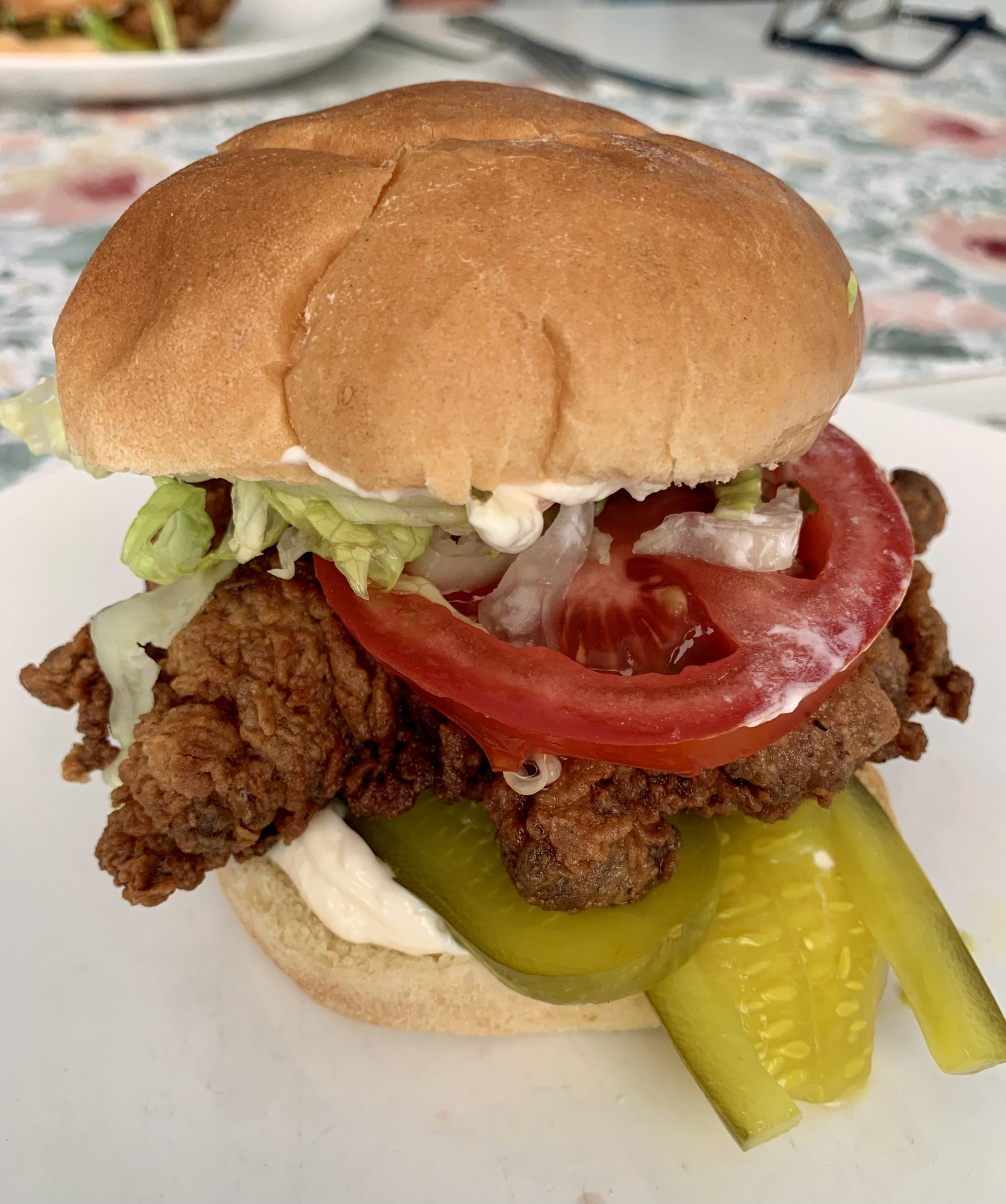 Place the fried chicken on a bun slathered in mayonnaise and top with shredded lettuce, dill pickles and tomato slices.
