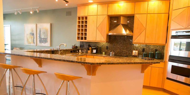 The contemporary home features wood floors, a wall of glass, harmonizing shades of biscuit and ivory with aqua. An impressive kitchen with granite countertops and floor to ceiling cabinets, specifically designed for the house, features handy cut-outs.