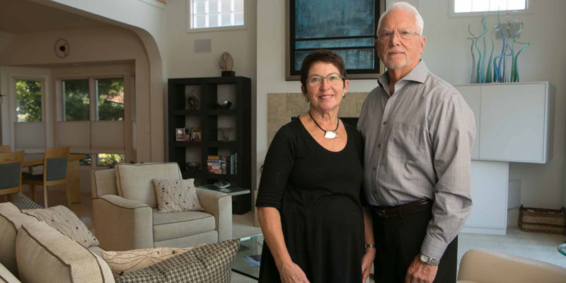 As you enter, clean lines, soft colors and subtle touches make Carl and Karen Fraker’s house striking and dramatic. The free floating staircase to the loft, embellished with glass, is stunning with alcove photos of grandchildren and unique sculpture accompaniments. The drama in the home is created by a one-of-a-kind chandelier lighting the foyer and dining area.