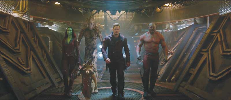 Peter Quill (aka Star Lord), played by Chris Pratt (The LEGO Movie, TV’s Parks and Recreation) represents the only seemingly human character in this unlikely team. His physical skills and comic timing provide perpetual entertainment after a stark beginning origin sequence. Peter draws from a gold mine of references that only he (and the audience) understands. His entertaining explanations enhance the effective dialogue even more. Gamora, played by Zoe Saldana (Avatar, Star Trek Into Darkness) is the adopted daughter of tyrannical “Titan” being Thanos, played by Josh Brolin. Drax, played by former pro wrestler Dave Bautista (Man With the Iron Fists) delivers a hilariously blunt wordplay amid his vengeful quest to get back at the main villain Ronan, who killed his family. The remaining team members are the wonderfully endearing tree creature Groot, voiced by Vin Diesel (The Fast and the Furious, Riddick) and wise-cracking, but brilliantly strategic genetically-engineered raccoon Rocket, voiced by Bradley Cooper (Silver Linings Playbook).